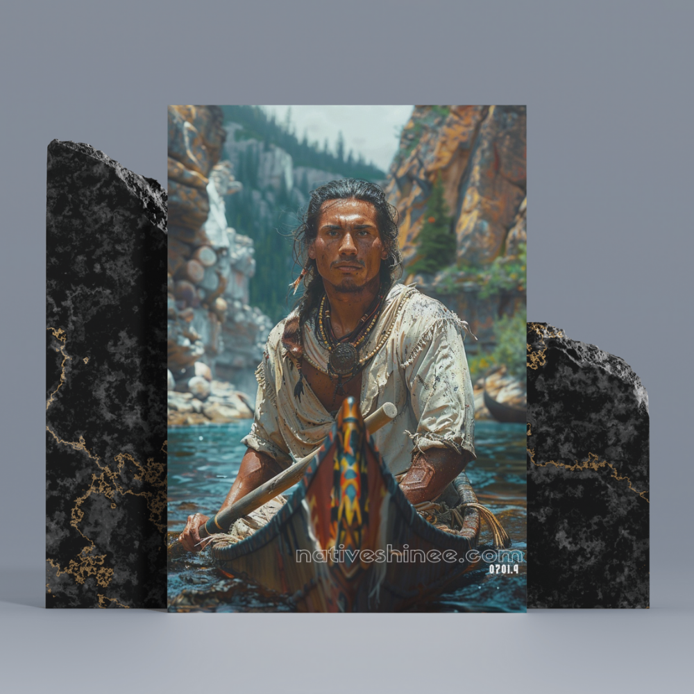 This striking portrait captures the essence of Native American strength and resilience. A warrior, sitting in a beautifully decorated canoe, paddles with purpose through the waters surrounded by towering rocks and nature’s splendor. His intense gaze reflects a deep connection to the land, his heritage, and the waters that have sustained his people for generations. Adorned with traditional beads and a symbolic pendant, his presence is a testament to the enduring spirit of Native American culture. The vibrant colors of the canoe, crafted with intricate patterns, further reflect the artistic richness and deep symbolism embedded in Native traditions. This artwork embodies the calm determination and natural harmony that define the Native American way of life.