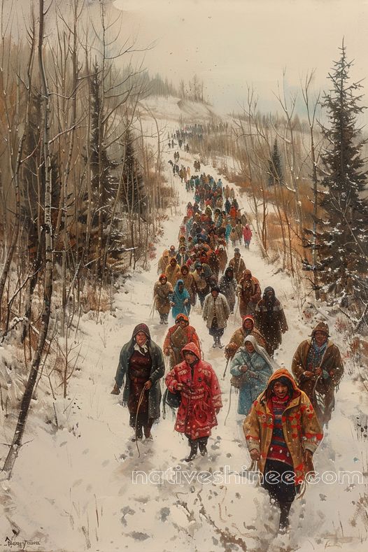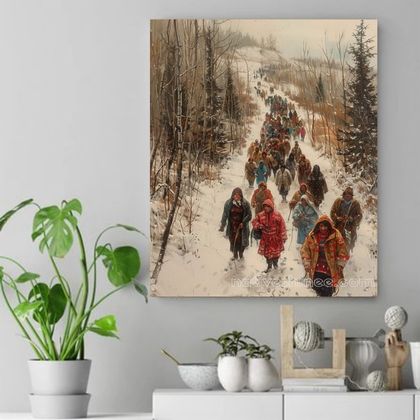 This evocative canvas illustrates a powerful scene of endurance as a group of Native American people journey through a snow-covered landscape. Clad in heavy winter garments, the group marches forward, facing the cold and hardship together. Their expressions and the slow yet determined pace reveal the strength that has carried them through adversity. Surrounded by barren trees and a blanket of snow, the image reflects the harsh reality of displacement and the enduring spirit of survival. The muted tones of the winter landscape contrast with the colorful patterns of their clothing, highlighting their rich cultural identity amidst challenging times. This artwork serves as a poignant reminder of resilience and unity, embodying the unbreakable bond shared by the tribe as they continue their journey.