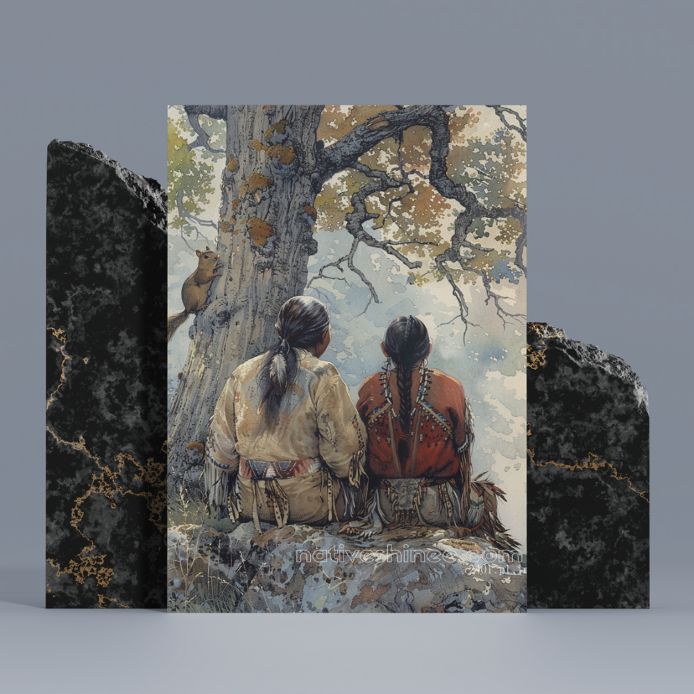 The Sacred Mountain Camp is a breathtaking canvas that captures the harmony between Native American culture and the majestic beauty of nature. Set against the backdrop of towering mountains, two traditional tipis stand beside a crystal-clear river, reflecting the surrounding wilderness. The sun casts a warm glow on the scene, highlighting the intricate details of the teepees and the wild horses grazing nearby. A lone figure walks along the shore, embodying the connection between the people and the land. This stunning image invokes a sense of peace, strength, and the eternal relationship between Native Americans and their sacred environment. Perfect for anyone who values nature, culture, and history