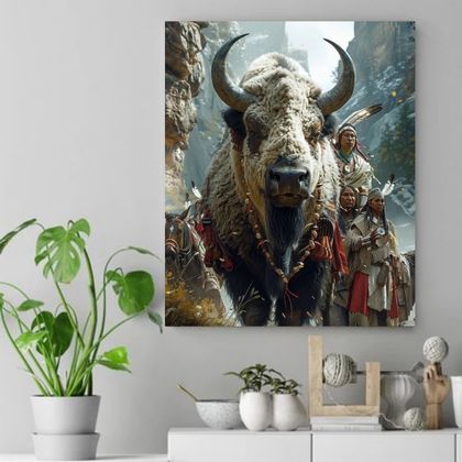 This breathtaking canvas captures the powerful presence of a rare white buffalo leading a procession of Native American warriors through a canyon. Revered as a symbol of hope and prosperity, the white buffalo stands at the forefront, surrounded by warriors adorned in traditional regalia. The rich details in the image evoke the deep spiritual significance of the buffalo in Native American culture, representing unity, strength, and sacred connection to the earth. The majestic landscape amplifies the timeless journey of this revered creature and its people, honoring their shared heritage and respect for the natural world.
