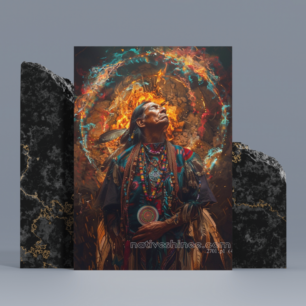 The Shaman's Vision" Native American Canvas depicts a powerful moment of spiritual connection and transformation. The elder shaman, adorned in vibrant traditional regalia and intricate beadwork, stands in front of a blazing fire. His head is held high in a state of reverence as mystical colors swirl around him, representing the flow of spiritual energy. The dynamic swirling of light and fire symbolizes the shaman’s connection to the unseen forces of nature and the universe. His face, deeply weathered yet serene, reflects a lifetime of wisdom and sacred knowledge passed down through generations. This artwork captures the essence of Native American spirituality, perfect for those who honor the sacred role of shamans and the spiritual journey they embark upon