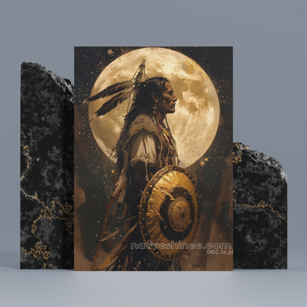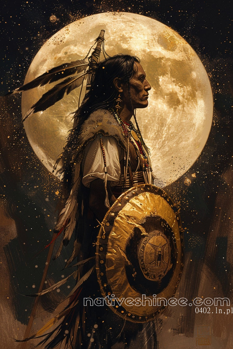 This powerful image captures a Native American warrior standing tall, bathed in the light of a full moon. His gaze is steady and resolute, embodying the strength and wisdom passed down through generations. Adorned with a beaded necklace, feathers, and a protective shield, he represents not only the spirit of a warrior but also the sacred connection to the earth and the stars above. The full moon, glowing in the background, serves as a symbol of guidance and protection, illuminating the warrior’s path. This artwork honors the resilience, bravery, and spiritual connection of Native American culture, evoking a deep sense of pride, protection, and reverence for the forces of nature and the ancestors who have walked before