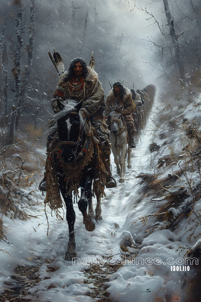 The Silent Journey captures the haunting beauty of Native American warriors braving the harsh winter elements, their journey through a snow-covered forest symbolic of their endurance and resilience. The lead figure, adorned in a rich fur cloak and traditional regalia, rides through the frosty terrain atop a black horse, while his companions follow closely behind. Their stoic faces reflect the trials they've endured, as snowflakes gently fall around them. The serene yet intense atmosphere speaks to the warrior's connection to nature, their tribe, and the unyielding spirit of survival. The scene’s somber tones and the fresh snowfall emphasize the cold yet steadfast courage of the group, making this piece an evocative reminder of their strength in the face of adversity.