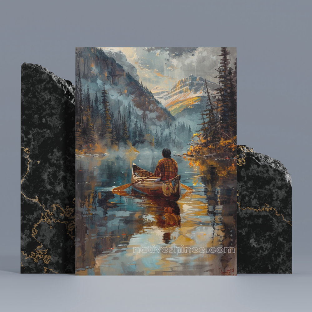 A breathtaking piece that captures the quiet strength of a lone Native American canoeing through the serene waters, with towering mountains and ancient forests reflected in the stillness of the river. The peaceful solitude of the scene speaks to the timeless relationship between the people and the land, evoking a deep connection to nature and the spiritual journey of the soul
