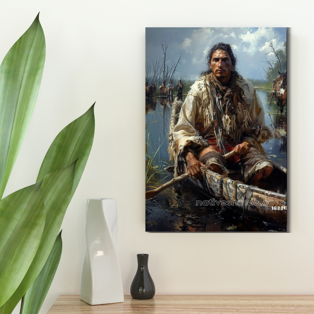 Poised on the edge of the water, a determined warrior grips his paddle, his gaze steady and unwavering. Encircled by marshland and his companions on horseback, he prepares to guide his canoe through the reflective waters of his homeland. The Silent Navigator Native American Canvas captures the essence of resilience, connection to nature, and the quiet strength that flows like the rivers through generations of Native tradition.