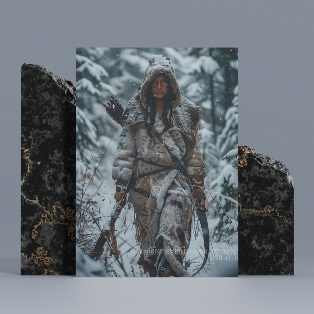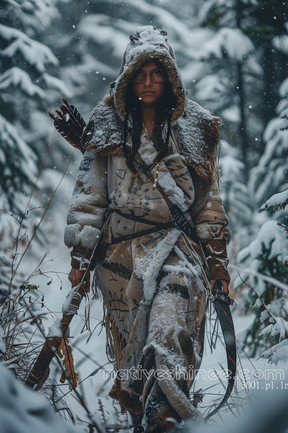 In the heart of the winter wilderness, a brave Native American woman stands alone against the snowstorm. Wrapped in furs for warmth, her face tells a story of resilience, strength, and a deep connection to the land she walks. Her arrow is ready, and her eyes are sharp with determination. As the snowflakes gently fall around her, she moves silently through the forest, embodying the spirit of a warrior who has learned to navigate the harshest of winters. This powerful image captures the spirit of survival, endurance, and connection to nature. The snow-covered landscape echoes her inner strength as she strides forward in pursuit of her goal, undeterred by the cold.