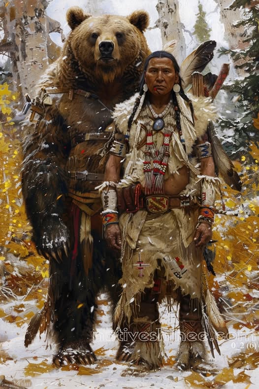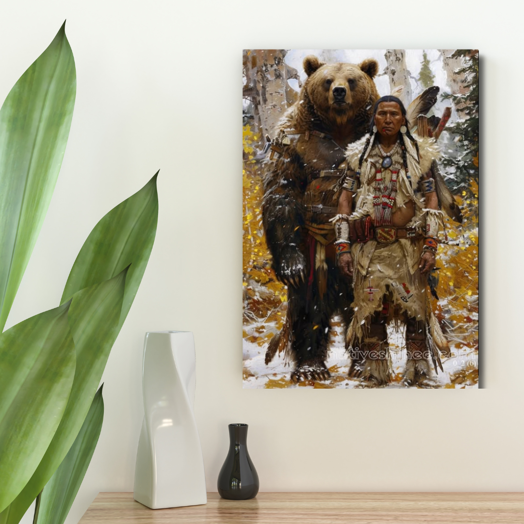 In a breathtaking display of harmony between human and nature, a Native warrior stands steadfast beside a towering bear, symbolizing the bond of strength and protection. The intricate beadwork and feathered attire of the warrior reflect a deep connection to tradition, while the bear's presence signifies wisdom and power. This stunning composition embodies the unbroken alliance between man and the spirit of the wild. A timeless masterpiece, The Spirit Guardian Native American Canvas