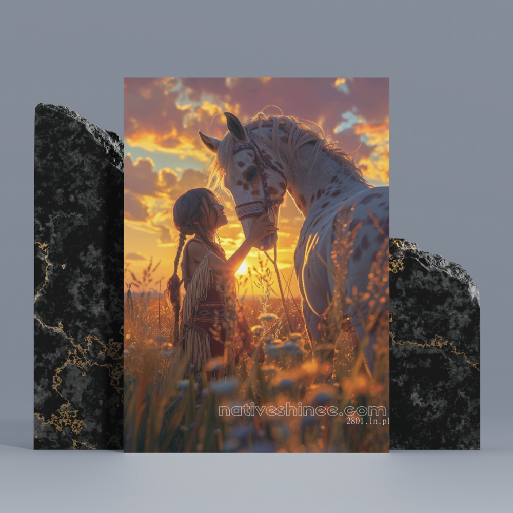 The Spirit of Friendship Native American Canvas captures a tender moment between a young Native American girl and her beloved horse, as they share a peaceful connection beneath a breathtaking sunset. The warm, golden light illuminates their faces, highlighting the deep bond between them. The girl's traditional attire, adorned with intricate beadwork and fringe, mirrors the harmony she shares with the natural world. This scene, full of love and trust, celebrates the enduring relationship between Native peoples and their animals. A perfect addition to any space, this canvas embodies the innocence of youth, the strength of connection, and the beauty of nature