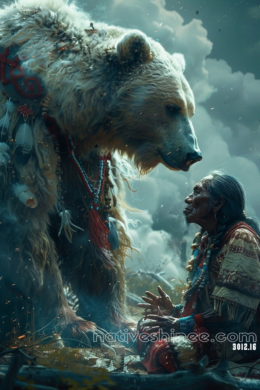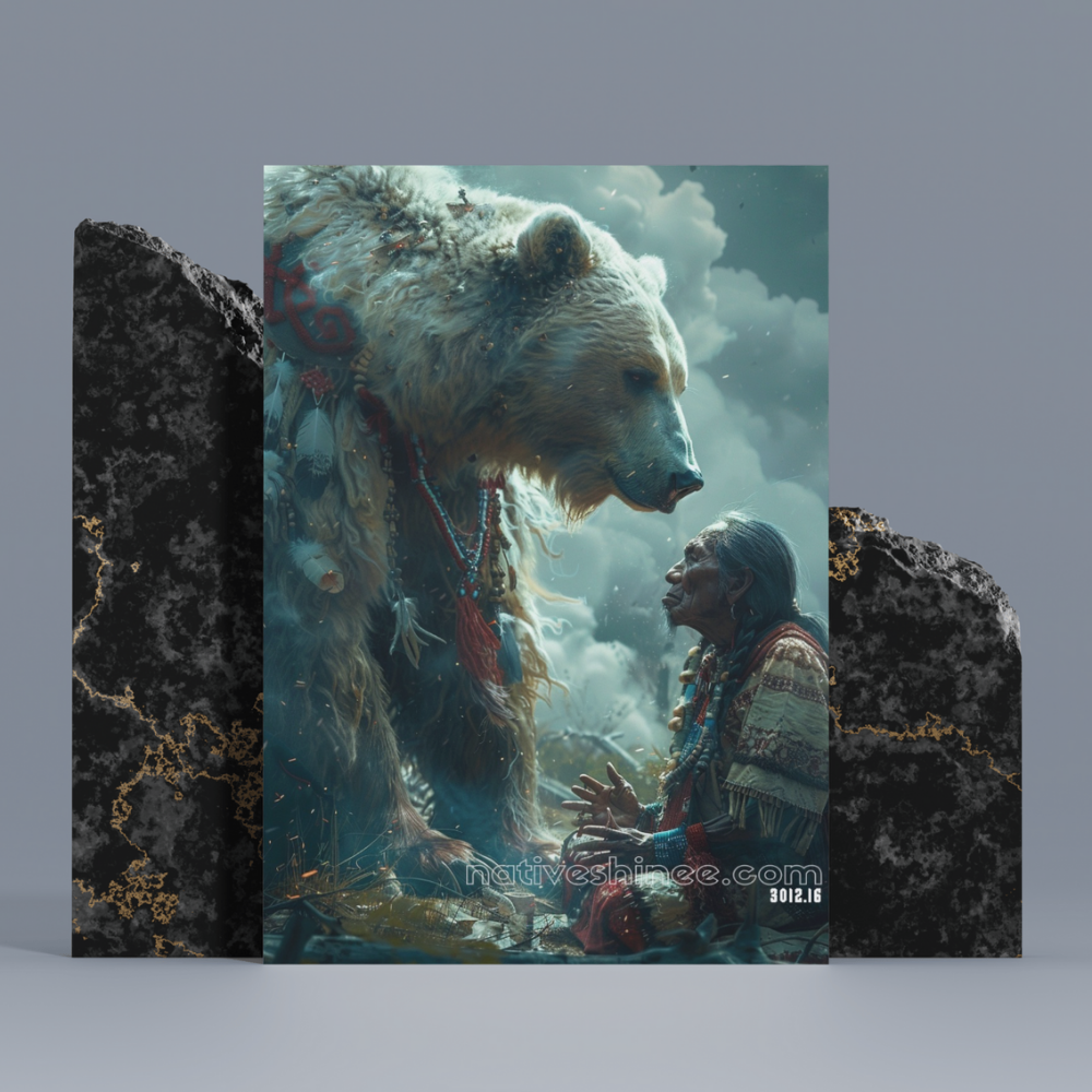 In a moment of deep reverence and spiritual connection, an elder Native American man kneels before a towering bear. Both adorned in sacred regalia, they share a sacred silence, as though they understand each other’s language beyond words. The bear, a symbol of strength, wisdom, and protection, gazes into the eyes of the man, who has devoted his life to honoring the spirits of nature. Together, they embody the eternal bond between humanity and the wild, a sacred relationship that has existed for millennia.