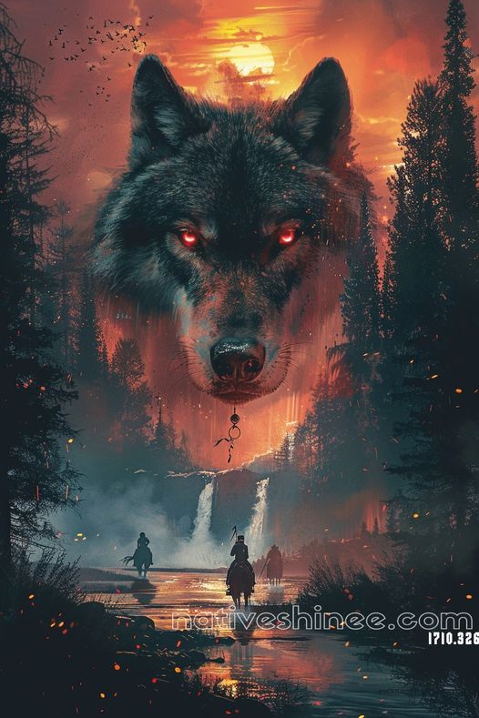 This striking canvas captures the haunting presence of the wolf spirit under a fiery twilight sky. With glowing red eyes symbolizing power and mystery, the wolf emerges as a guardian of the forest, watching over riders traversing a mystical landscape of cascading waterfalls and shadowy trees. The vivid hues of the burning sunset and the ethereal glow evoke a sense of otherworldly beauty, honoring the Native American reverence for wolves as protectors and symbols of intuition and strength. A captivating piece to inspire awe and imagination in any setting.