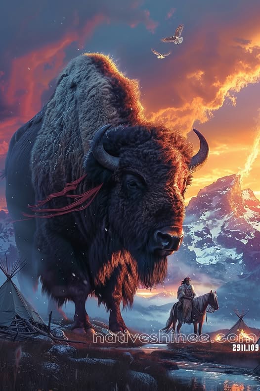 The Spirit of the Plains: A Native American Canvas depicts a towering bison, a sacred symbol of strength, abundance, and survival in Native American culture, standing majestically against a breathtaking sunset over snowy mountains. Below, a lone rider and their horse add a sense of humility and reverence to the scene, their presence dwarfed by the immense power and spiritual significance of the bison. This image beautifully encapsulates the profound connection between nature, spirit, and humanity, evoking the timeless wisdom and respect for the natural world held by Native American traditions