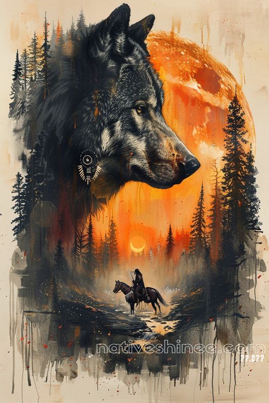 A lone warrior rides under the light of the full moon, his path illuminated by the powerful presence of a wolf spirit watching over him. The fiery hues of the sky, with deep oranges and reds, create a dramatic backdrop, symbolizing strength and resilience. This canvas captures the mystical connection between man and nature, embodying the courage and guidance of the wolf spirit. A perfect representation of Native American spirituality, this artwork evokes a deep sense of protection, wisdom, and harmony with the wild.