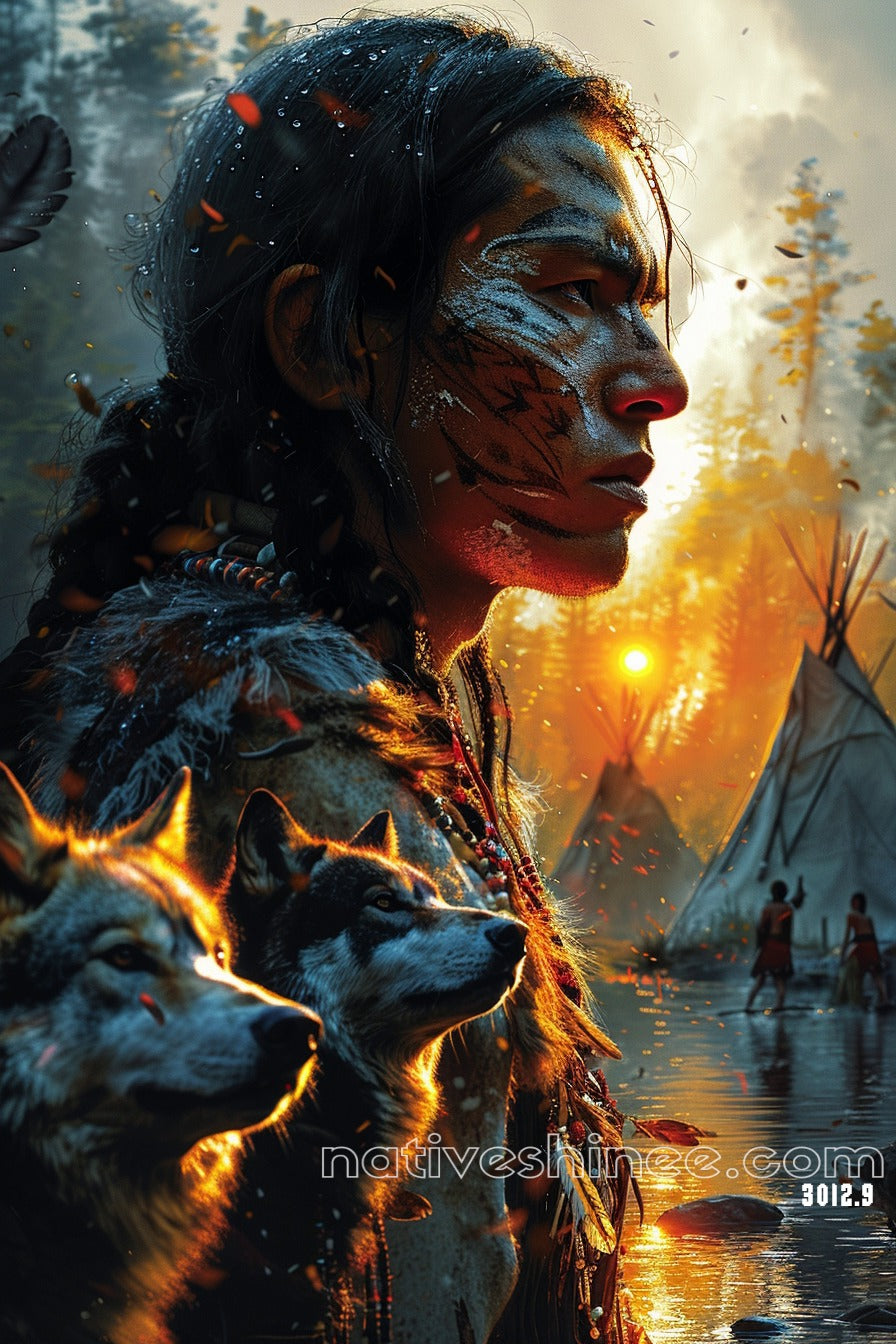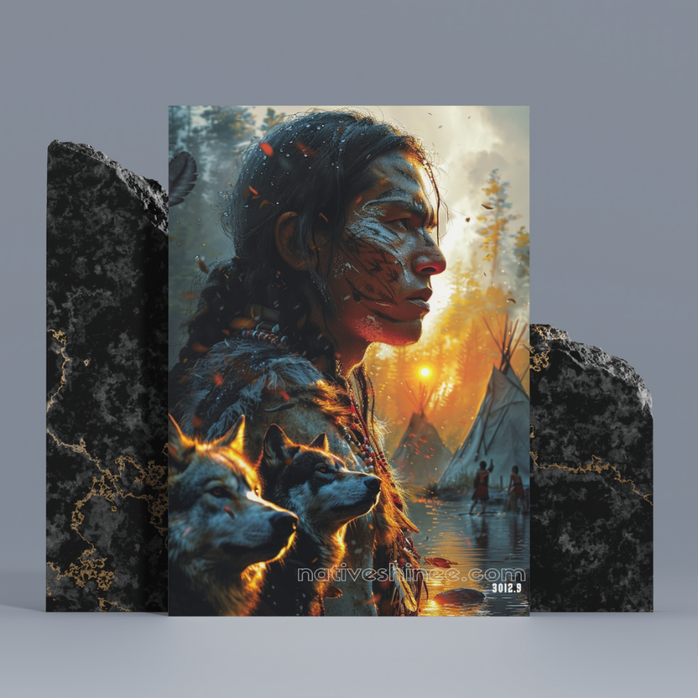 The Spirit of the Wolf captures the deep, mystical connection between a Native American warrior and the wolves who walk beside him. As the sun sets behind them, casting a fiery glow across the landscape, the warrior stands tall with his loyal companions, embodying the strength, wisdom, and fierce protection of the land. The wolf, a sacred symbol of guidance and loyalty, mirrors the warrior's resolve as they both look towards the horizon. This powerful image speaks to the enduring bond between man, animal, and nature. Native American Canvas brings this sacred relationship to life, where the warrior’s spirit is forever intertwined with that of the wolf.