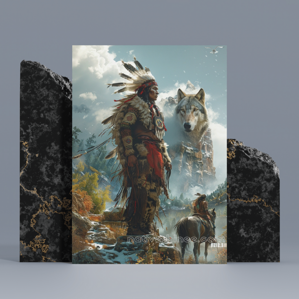 The Spirit of the Wolf captures the deep bond between Native Americans and the animals of the land. A proud warrior stands firm amidst the breathtaking wilderness, adorned in ceremonial attire, his gaze steady and proud as the spirit of the wolf watches over him from the misty cliffs. This powerful scene of unity between man and nature evokes the strength, resilience, and sacred connection that defines Native American culture. As the wolf guides, the warrior stands as a protector, bound to the land, its creatures, and the ancient spirit that has endured through the ages