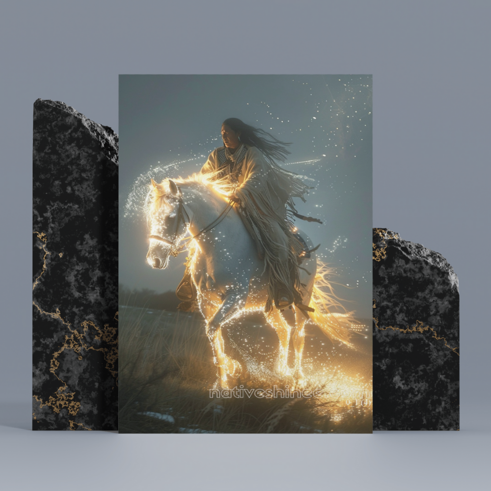 The Spirit Rider evokes the ethereal connection between the Native American warrior and the spirit of the land. As the warrior rides his majestic horse, both horse and rider are illuminated with a mystical glow, as though infused with the energy of the earth itself. The swirling lights surrounding them represent the harmony of nature, the ancestors, and the stars. The scene, bathed in twilight, reminds us of the strength, wisdom, and deep spirituality that runs through every Native American story.