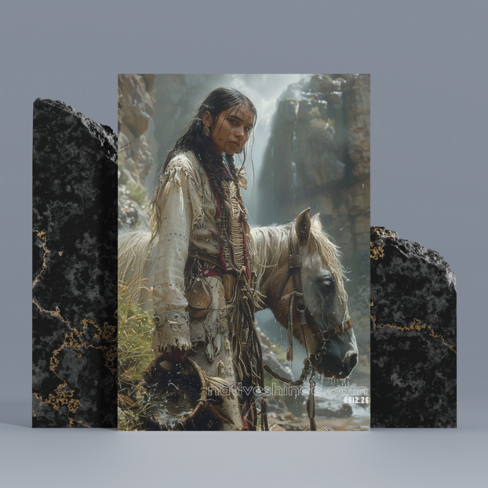 This captivating image tells the story of resilience, connection, and reverence for nature. A Native American warrior, draped in intricately adorned clothing, stands tall beside his horse, as the shimmering waters flow from the basket in his hands. The mist from a nearby waterfall dances around him, adding a mystical quality to the scene. The warrior’s gaze, deep and unwavering, speaks to a sacred connection with the land and its elements. The lush surroundings and rushing waters reflect the strength, grace, and balance of this timeless relationship with nature, a true embodiment of peace and power.