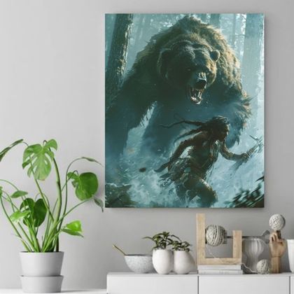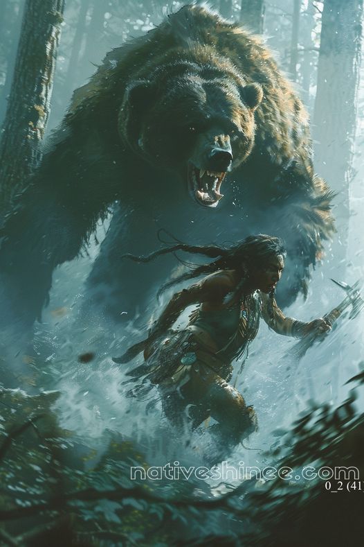 In the heart of the ancient forest, a fierce encounter unfolds between a Native American warrior and a towering grizzly bear. The warrior, agile and determined, wields a spear as he navigates the misty undergrowth, each step blending survival and courage. Behind him, the bear, a symbol of raw power and nature's wrath, roars with primal intensity. This dramatic scene captures the tension between man and beast, reflecting the delicate balance of respect and survival that defines their relationship. It is a testament to the unyielding spirit of those who live in harmony with the wild, embodying both bravery and reverence for the natural world.