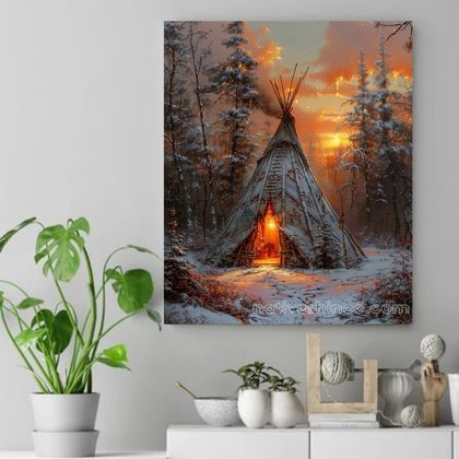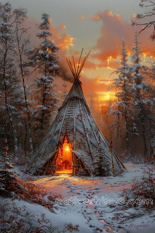 As the sun sets over the snowy woods, the teepee glows with a welcoming light. This image speaks to the resilience of our people, where even in the coldest winters, we find warmth in our homes and our hearts. The flicker of the fire echoes the spirit of our ancestors, who taught us to endure with grace, to find beauty in every season, and to let the land guide our way.