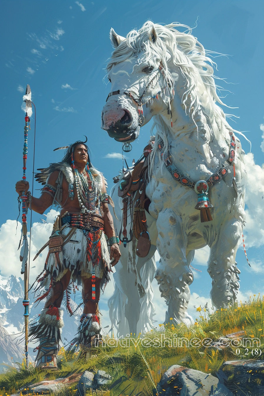 This stunning Native American canvas artwork depicts a warrior standing tall with his majestic white horse, a symbol of strength, resilience, and spiritual connection. The vibrant colors of their adorned attire and the horse's ornate decorations showcase the deep cultural heritage and reverence for nature that Native Americans hold. Set against a breathtaking backdrop of rugged mountains and clear skies, this artwork conveys the bond between warrior and steed, two forces united by a shared purpose. Perfect for those who appreciate the beauty of Native American culture and the powerful symbolism of animals in spiritual practices.