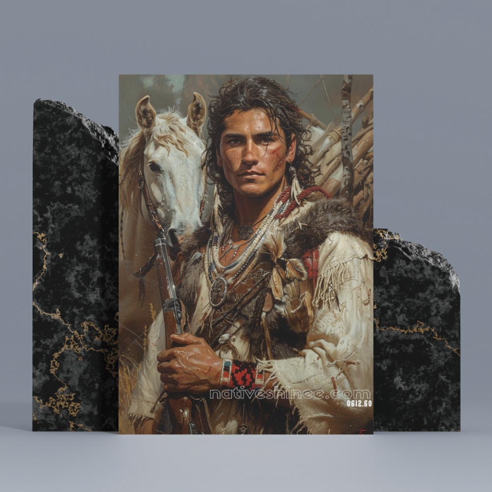 This striking canvas captures a young Native American warrior, exuding strength and pride. His sharp, focused gaze meets the viewer, offering a glimpse of his fierce spirit and connection to his heritage. Dressed in traditional attire, adorned with beads, feathers, and a ceremonial necklace, the warrior stands resolute. Behind him, his trusted white horse provides a sense of loyalty and connection to the land. With a rifle in hand, he stands prepared to defend his people and culture, his posture symbolizing the harmony between nature, animal, and man. The rugged landscape and detailed textures of his clothing further reflect his deep-rooted traditions and warrior spirit.