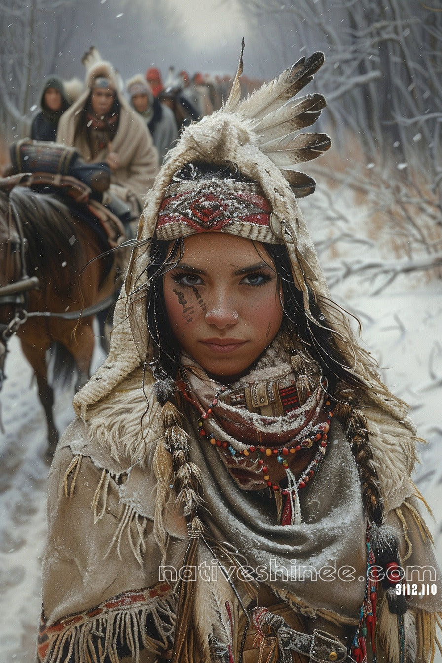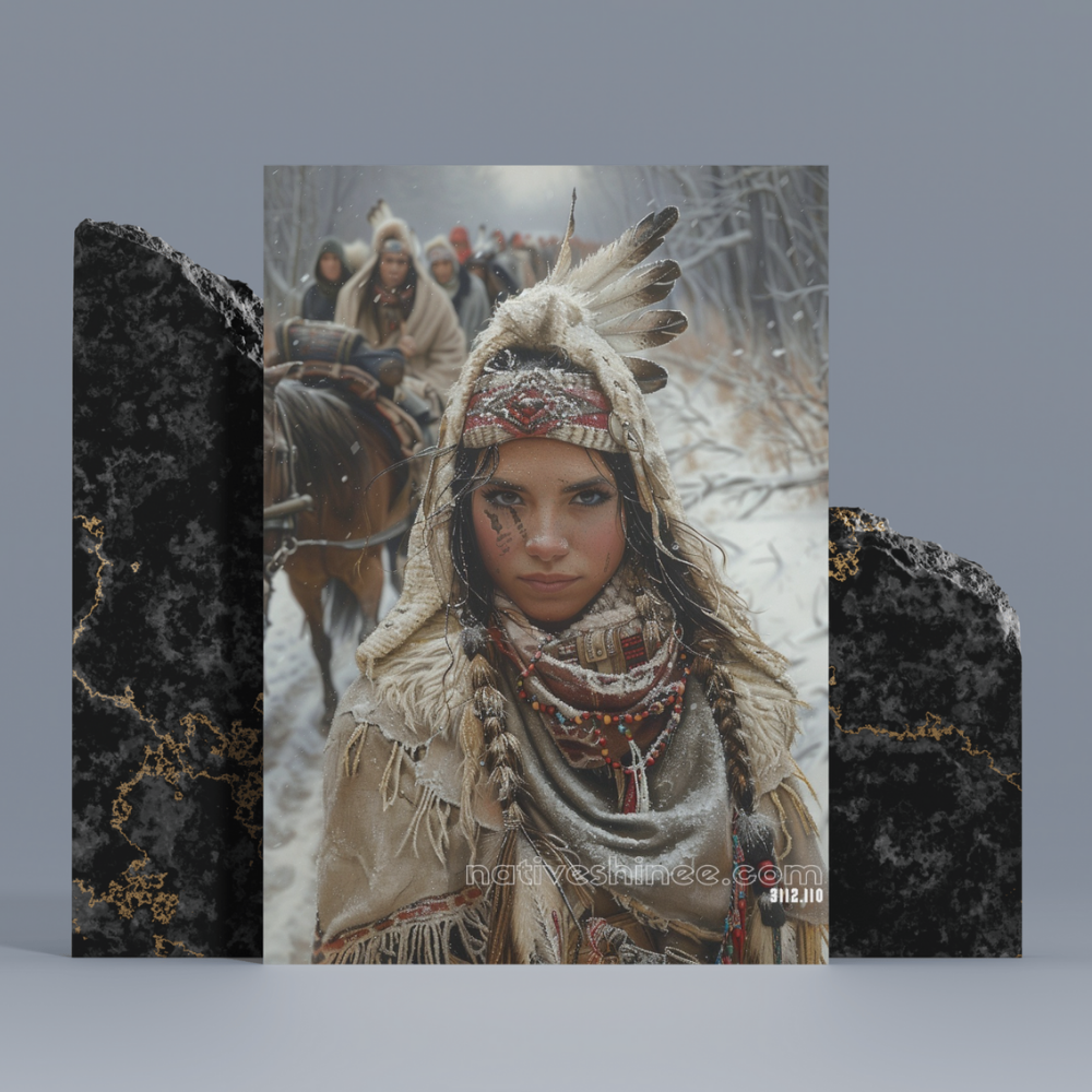 The Warrior's Gaze captures the unyielding spirit of a young Native American woman, her eyes filled with strength and determination. Standing at the heart of a snow-covered landscape, she is adorned in traditional attire, complete with intricate beadwork, feathers, and symbolic markings. Behind her, the snow falls gently on her companions, their figures fading into the winter haze. This painting evokes a deep connection to the land, culture, and resilience of the Native American people, brought to life with extraordinary detail and emotional depth. A powerful reminder of the strength and grace that defines their legacy, Native American Canvas offers you a moment frozen in time.