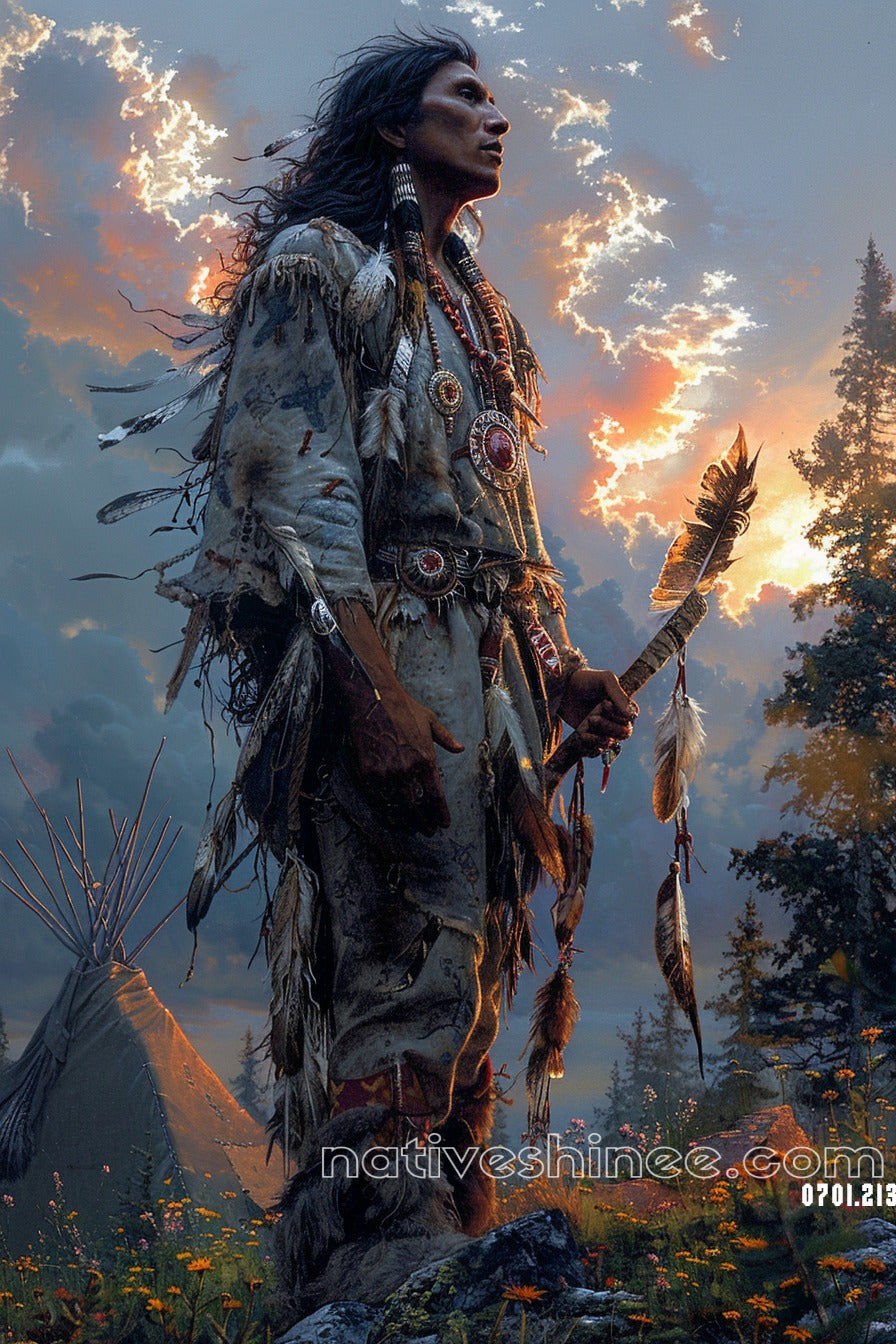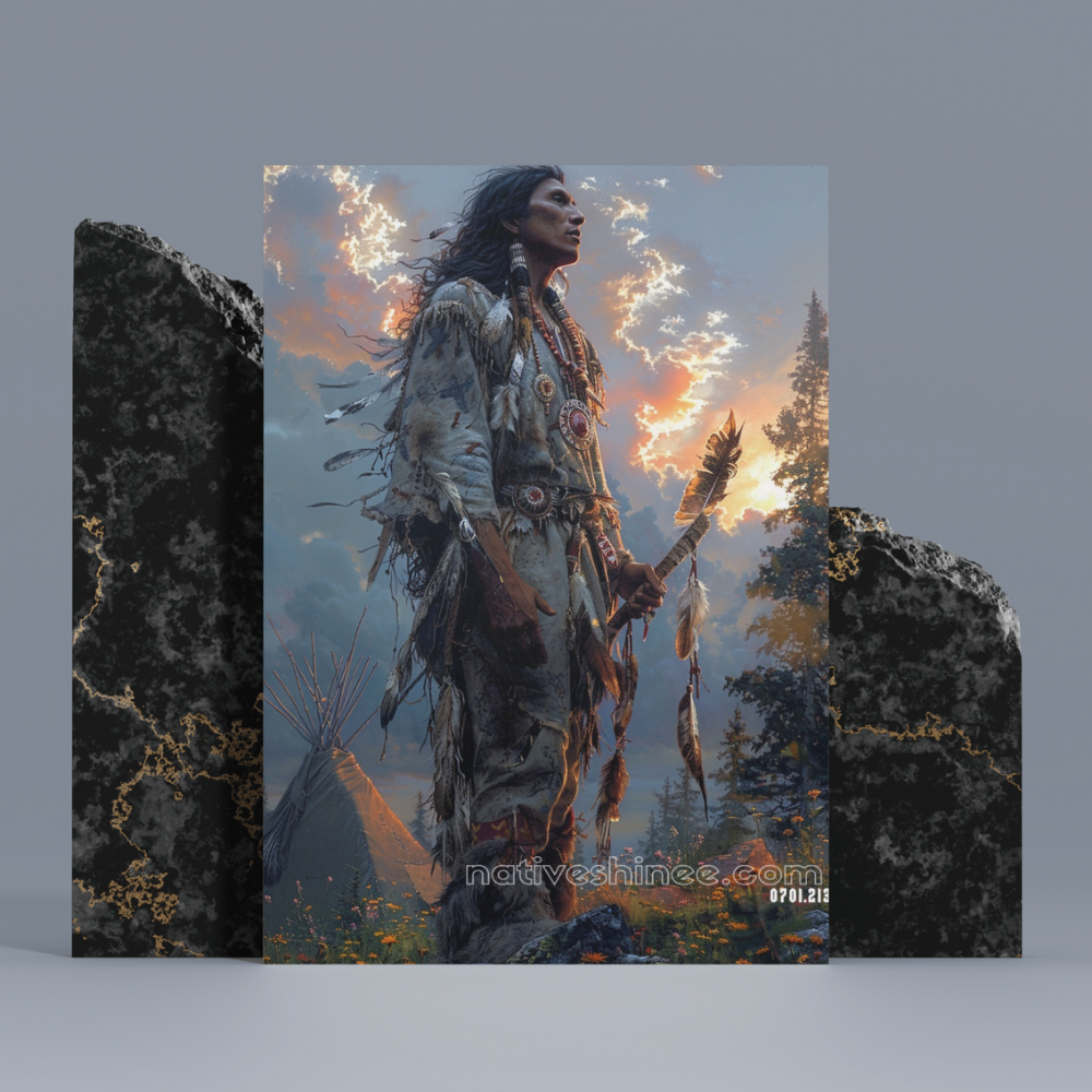 The Warrior's Legacy Native American Canvas captures a moment of profound strength and spiritual connection as a Native American warrior stands tall against the backdrop of a breathtaking sky. Clad in traditional attire adorned with feathers, beads, and intricate designs, his gaze is focused and resolute, embodying the powerful legacy of his ancestors. Holding a feathered spear in one hand, he stands with pride, a protector of his people and traditions. The majestic mountains and the warm light of the setting sun amplify the feeling of determination and reverence. This painting encapsulates the essence of resilience, honor, and the deep bond between the warrior and the land, making it a stunning tribute to Native American culture and spirit.