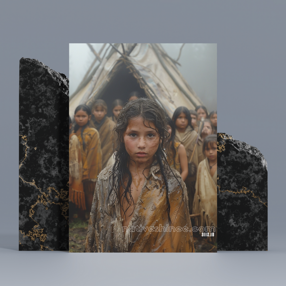 The Watchful Eyes captures the unspoken strength and resilience of Native American youth, portrayed through the piercing gaze of a young girl surrounded by her peers. Covered in the dirt and mist of the land, her expression speaks of endurance, survival, and hope for the future. The scene evokes the harshness of the times, yet the spirit of the young generation shines through, ready to carry on the legacy of their ancestors.