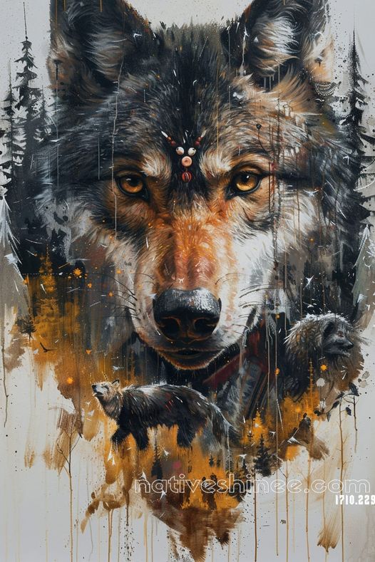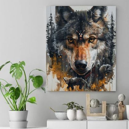 A mesmerizing depiction of a wolf's gaze, piercing and filled with the wisdom of the wilderness. This artwork beautifully blends nature and mysticism, with cascading brushstrokes that evoke a sense of motion and life. Behind the wolf's face, a serene forest and the shadows of roaming bears emerge, creating a dynamic connection between predator and the wild. The earthy tones and intricate details highlight the wolf's symbolic role as a guide and protector. This piece captures the essence of harmony and power within nature, making it a tribute to the untamed spirit of the wild.