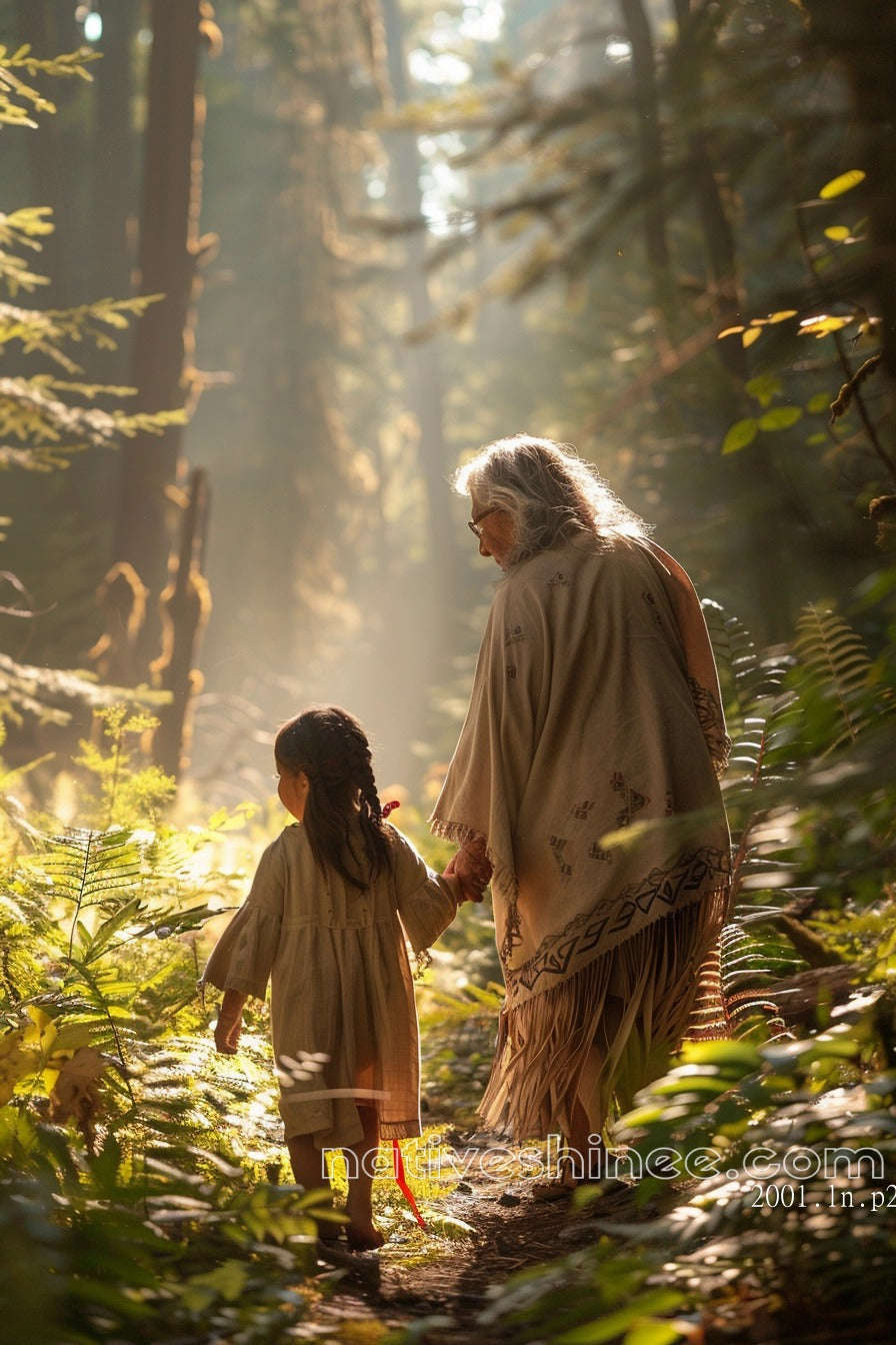 Through the Forest of Generations showcases a heartwarming moment between a grandmother and her granddaughter as they walk hand-in-hand through the sunlight-dappled forest. The gentle rays of light filter through the towering trees, casting a golden glow on their traditional attire, symbolizing the timeless bond between them. The forest around them stands as a testament to nature's beauty, while their shared journey reflects the passing down of wisdom and love from one generation to the next. This beautiful canvas evokes feelings of serenity, connection, and the enduring strength of family, perfect for anyone who cherishes moments of togetherness.