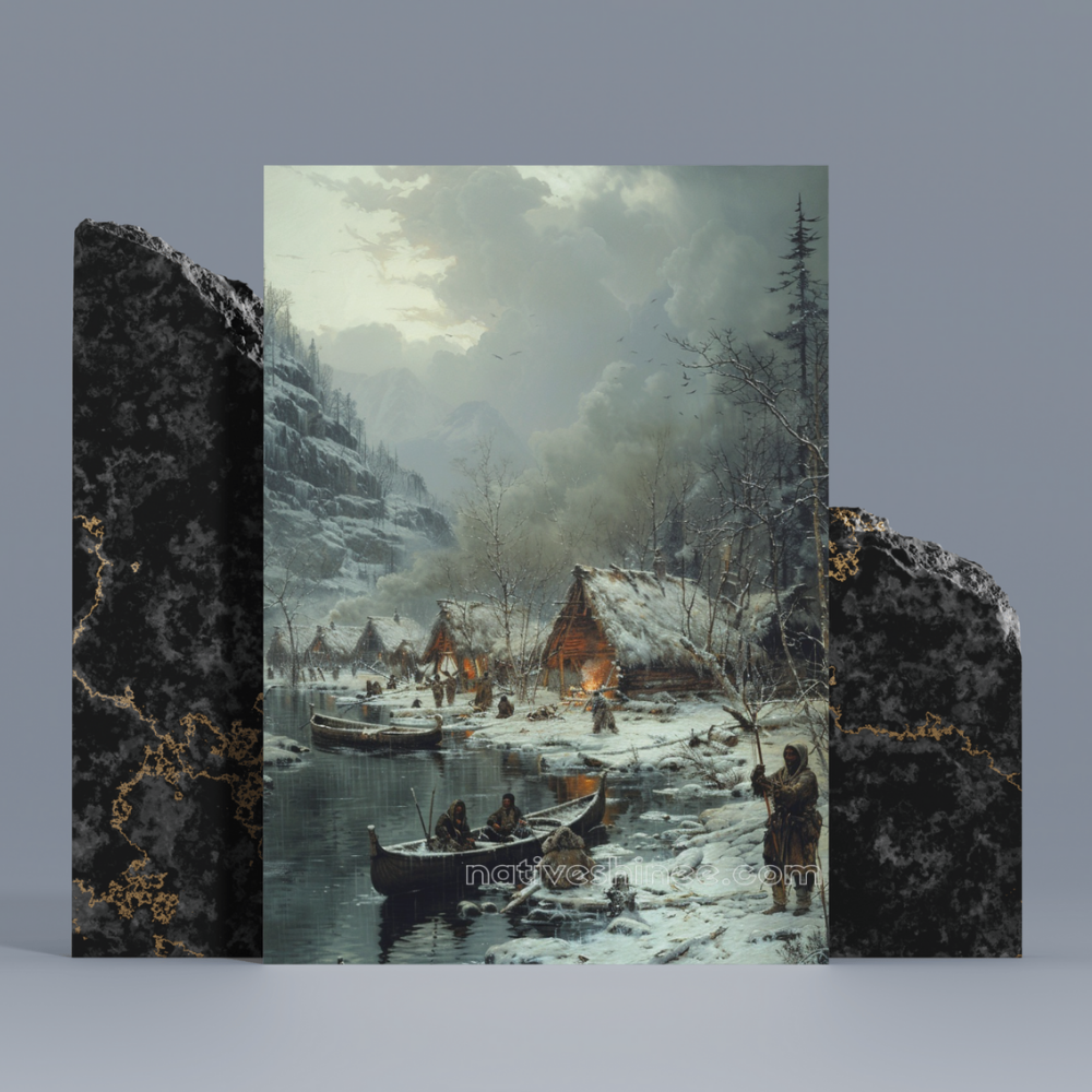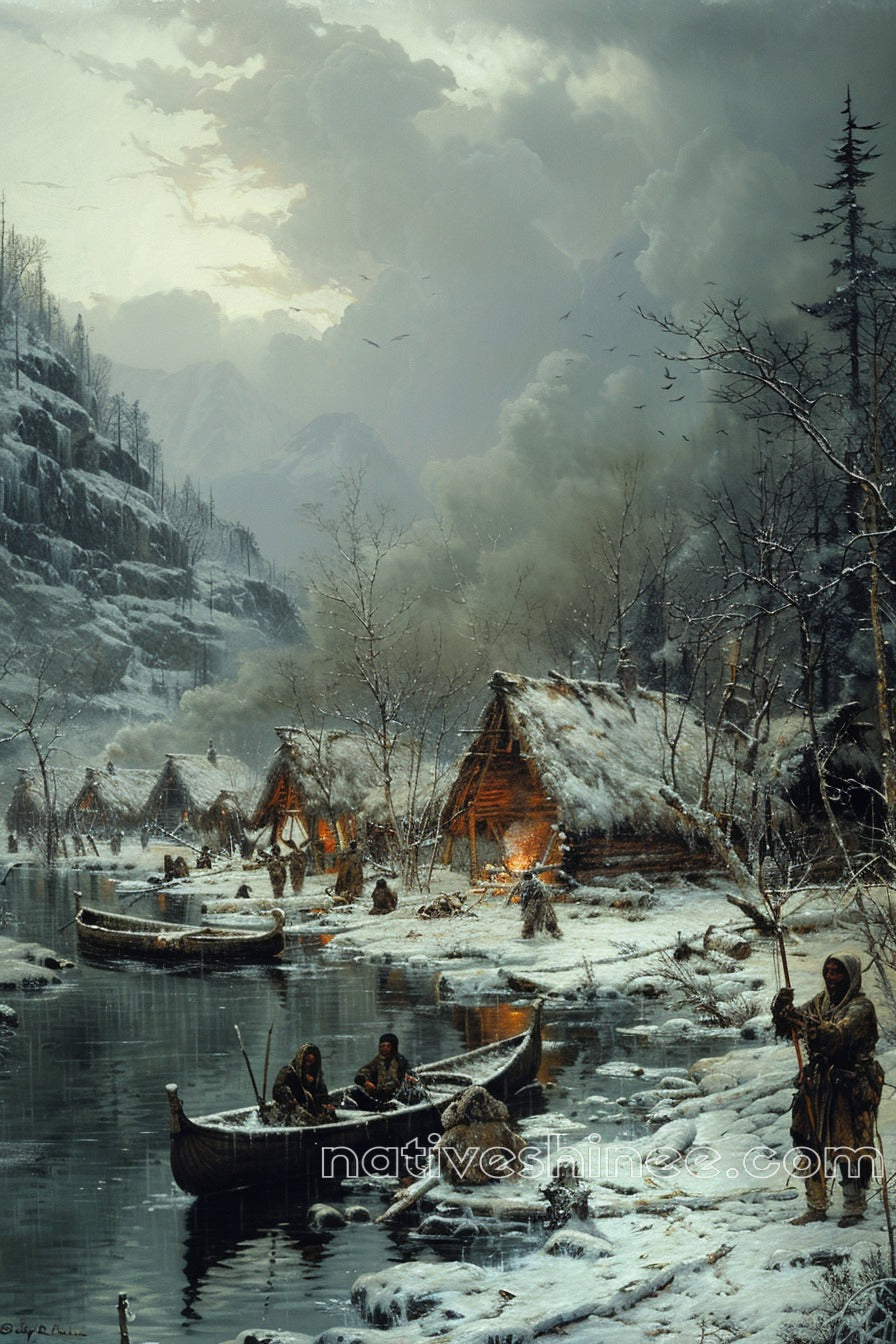This captivating image portrays a Native American village nestled beside a serene, frozen river, surrounded by snow-covered mountains. The warm glow of firelight radiates from several sturdy huts, which are constructed with natural materials and designed to withstand the harsh winter. The peaceful scene is interrupted only by the movement of two canoes gliding quietly through the water, their occupants bundled up against the cold. The landscape, heavy with snow, evokes a sense of serenity and quiet endurance, while the distant mountains stand as a symbol of the timelessness and resilience of the people who call this place home.