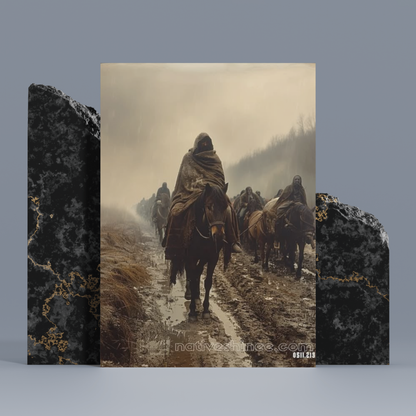 Trail of Shadows: A Native American Canvas captures a somber and powerful journey through a mist-covered landscape. Cloaked figures ride atop horses, their silhouettes shrouded by heavy blankets as they move along a muddy, rain-soaked path. The muted earth tones and dense fog paint a scene of hardship and perseverance, symbolizing resilience in the face of adversity. The leader at the forefront rides with quiet determination, guiding the procession through an unforgiving terrain that echoes with the weight of history. This canvas reflects a poignant moment of survival, strength, and unity, honoring the enduring spirit of Native American people.