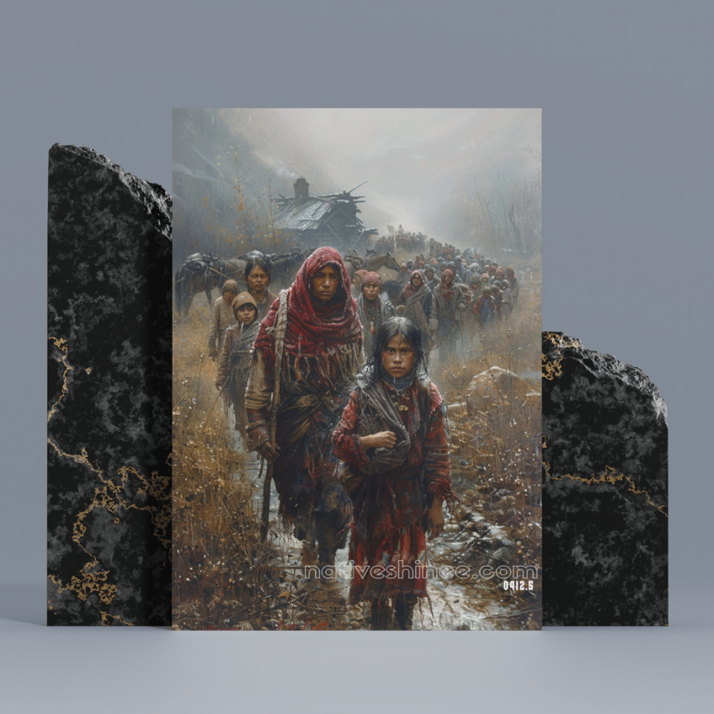 A heart-wrenching depiction of resilience and sorrow, this canvas captures a Native American family leading a solemn procession through a desolate and rain-soaked landscape. The vivid red shawl of the central figure stands out as a symbol of strength and defiance amidst the muted, dreary tones of their surroundings. The young girl, her gaze unwavering, embodies the hope and determination of a people enduring unimaginable hardship. The trail of individuals behind them, cloaked in worn fabrics, tells a story of forced migration and the struggle to preserve identity and dignity. This piece resonates deeply, honoring the indomitable spirit of Native American heritage.