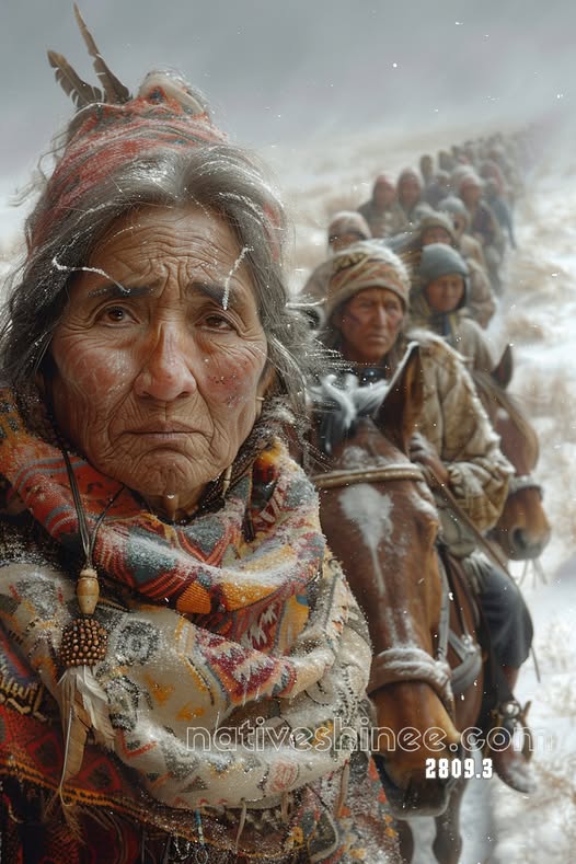 Trail of the Forgotten portrays the haunting endurance of a people journeying through hardship and exile. In this evocative work, an elderly Native woman leads a line of riders stretching into the frozen horizon, her face marked by years of strength, sorrow, and survival. Wrapped in a richly patterned blanket, she becomes both a symbol of heritage and a witness to loss. Behind her, generations follow—silent, resolute, and bound by the shared weight of memory. The cold air bites at their skin, the snow gathers in their hair, yet their spirit endures, carried forward by dignity and love for their homeland. This canvas captures not only physical endurance but the unbroken continuity of culture through suffering. It speaks to the resilience of Native identity, reminding viewers that history’s deepest scars also bear humanity’s greatest strength.