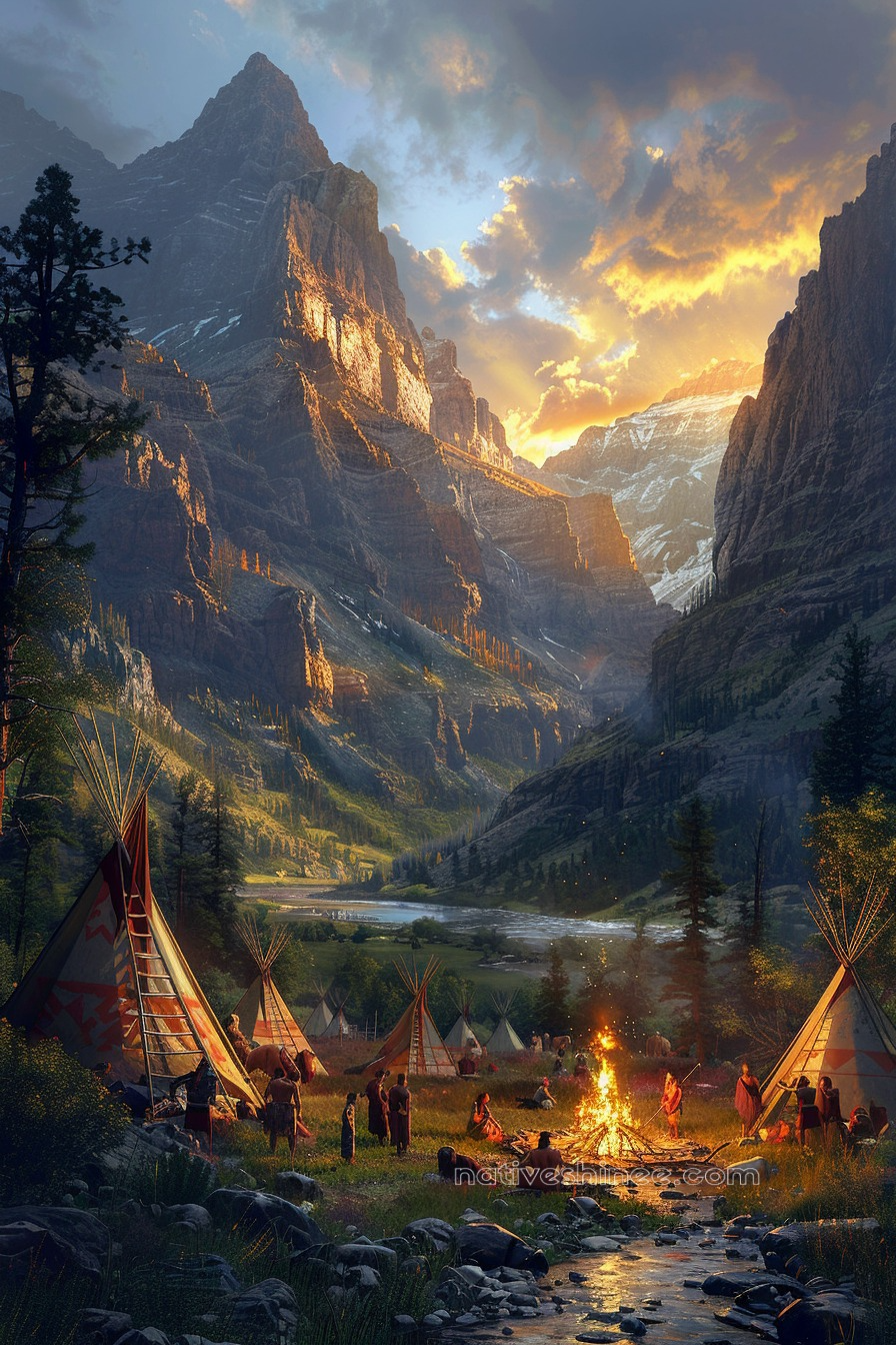 Tribal Campfire in Serene Valley Setting Native American Canvas
