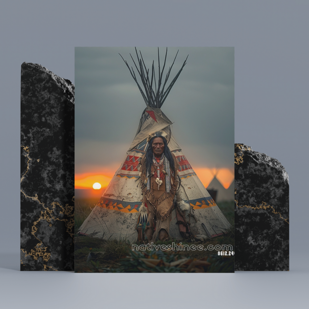 This powerful Native American Canvas portrays a tribal warrior standing strong before his teepee, with the setting sun in the background. Adorned in traditional attire, complete with intricate beadwork and feathers, the warrior’s intense expression reflects the strength and resilience of Native American culture. The teepee and vibrant sunset symbolize the deep connection to heritage and the land. This high-quality canvas print is perfect for anyone who values Native American traditions and history. It makes a striking addition to any home or art collection, celebrating the timeless legacy of indigenous warriors.