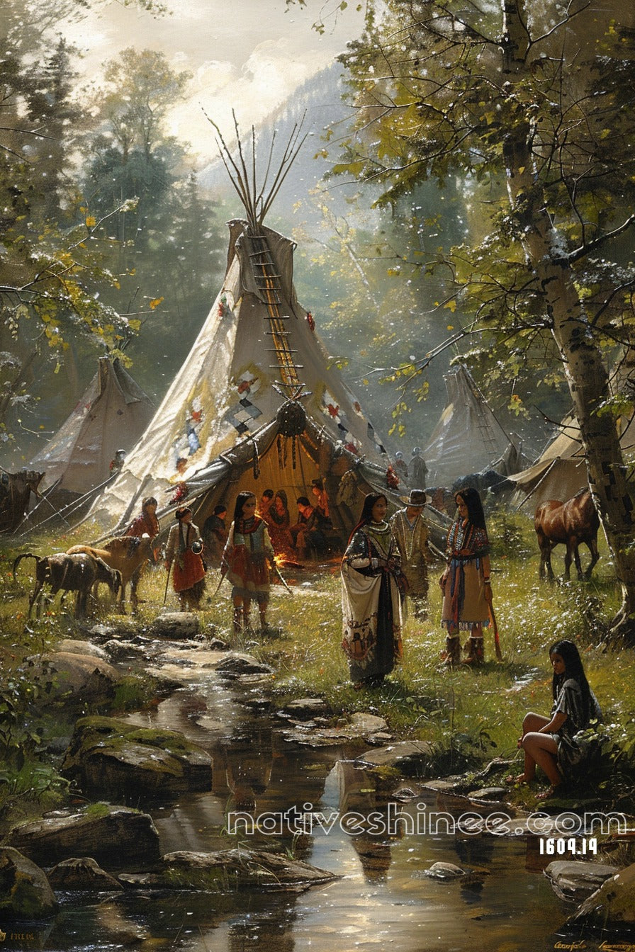 This striking canvas portrays a Native American warrior standing atop a grassy hill, his silhouette framed against a vibrant twilight sky awash with deep purples, oranges, and reds. Clad in traditional attire with a feathered headdress and beaded vest, he holds a spear aloft, embodying strength and vigilance. Below, a herd of buffalo grazes peacefully on the plains, their dark forms contrasting with the glowing horizon, while distant teepees dot the landscape, hinting at a thriving community. The interplay of warm sky tones and cool earth hues creates a dramatic yet serene atmosphere, evoking a sense of guardianship over the land. This artwork captures the essence of indigenous resilience and harmony with nature, making it a bold and inspiring addition to any space.