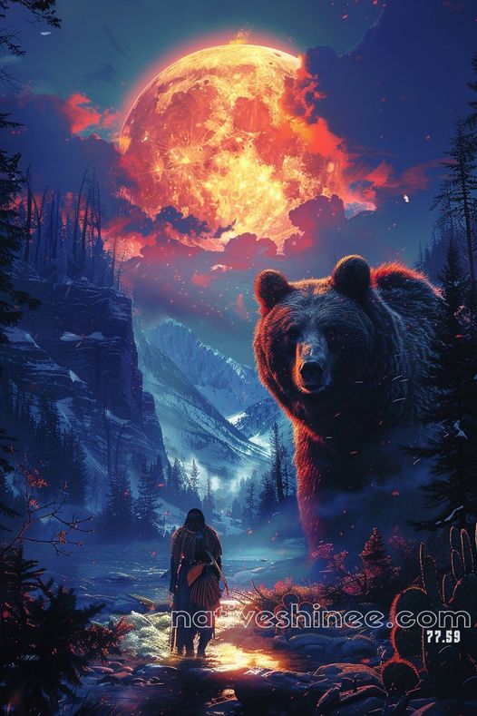 A lone Native figure walks along the riverbank, dwarfed by the imposing figure of a majestic bear that stands as a guardian in the wilderness. Above them, a fiery crimson moon casts an otherworldly glow, painting the sky with streaks of red and orange. The towering mountains and dense forests add to the mystical ambiance of the scene, where nature and spirit collide in powerful harmony. The bear, a symbol of strength and protection, seems to watch over the figure, guiding them through the sacred landscape under the watchful eye of the radiant moon.