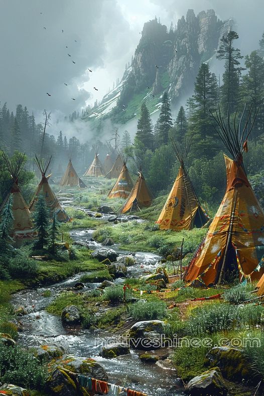In this tranquil scene, a serene Native American village lies nestled in a lush valley, surrounded by towering mountains and tall pines. Colorful tipis line a gentle stream that winds its way through the village, reflecting the soft light of the misty morning. The calm atmosphere is filled with the sounds of nature, as birds soar above and the flow of the stream carries the spirit of the land. The peacefulness of this canvas captures the harmony between the people and their environment, illustrating a deep connection to nature and a way of life in balance with the earth. This artwork invites viewers into a serene world of unity, where nature and culture are one.