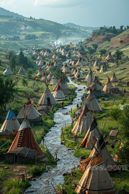 This stunning canvas showcases a sprawling Native American village, where countless teepees line a meandering stream that flows through the heart of a lush valley. The vibrant landscape, framed by rolling hills and distant mountains, speaks of a harmonious community thriving in tune with nature. Smoke rises gently from the teepees, indicating the daily life and warmth within. This scene evokes a sense of unity and tradition, where each family’s dwelling contributes to the larger fabric of the village. The image captures the beauty and simplicity of life deeply connected to the land and its sacred waters.