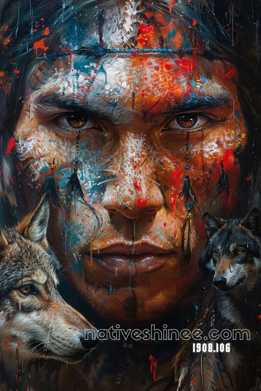 This canvas depicts a Native American shaman in a tranquil twilight setting, his face painted with tribal symbols and his robe adorned with intricate beadwork and feathers, holding a staff adorned with charms. He stands on a grassy hill overlooking a herd of buffalo grazing near a shimmering lake, their silhouettes dark against the fading orange and purple sky. The landscape features rolling hills, sparse trees, and a distant mountain range, bathed in the soft glow of dusk. An owl perches nearby, its eyes reflecting the twilight, symbolizing wisdom and guidance. The interplay of light and shadow highlights the texture of his robe, the buffalo’s fur, and the gentle ripples on the water, creating a mystical and peaceful atmosphere. Birds soar in the distance, adding a sense of movement to the serene scene. The shaman’s pose suggests a moment of vision or prayer, connecting deeply with the land and its creatures. This artwork captures a spiritual bond with nature, evoking reverence and the quiet beauty of twilight. The detailed composition invites viewers to feel the shaman’s vision unfolding across the plains.