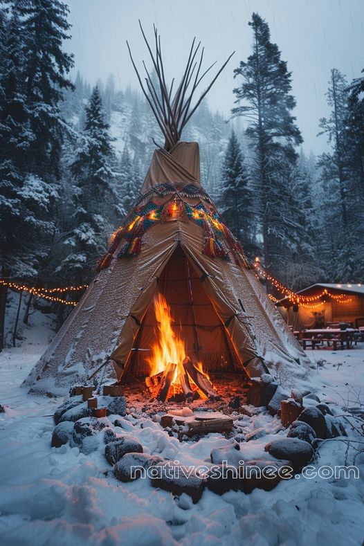 This striking canvas captures the peaceful serenity of a snowy winter night, where a traditional Native American teepee glows warmly in the midst of a cold, snowy forest. Decorated with colorful lights and illuminated by a central fire, the teepee radiates a sense of warmth, community, and tradition. The snow gently falls around the camp, creating a magical winter wonderland. Perfect for those who seek a reminder of the beauty of nature and the comfort of togetherness, even in the harshest environments. This artwork evokes both tranquility and the timeless connection to Native American culture and the natural world.