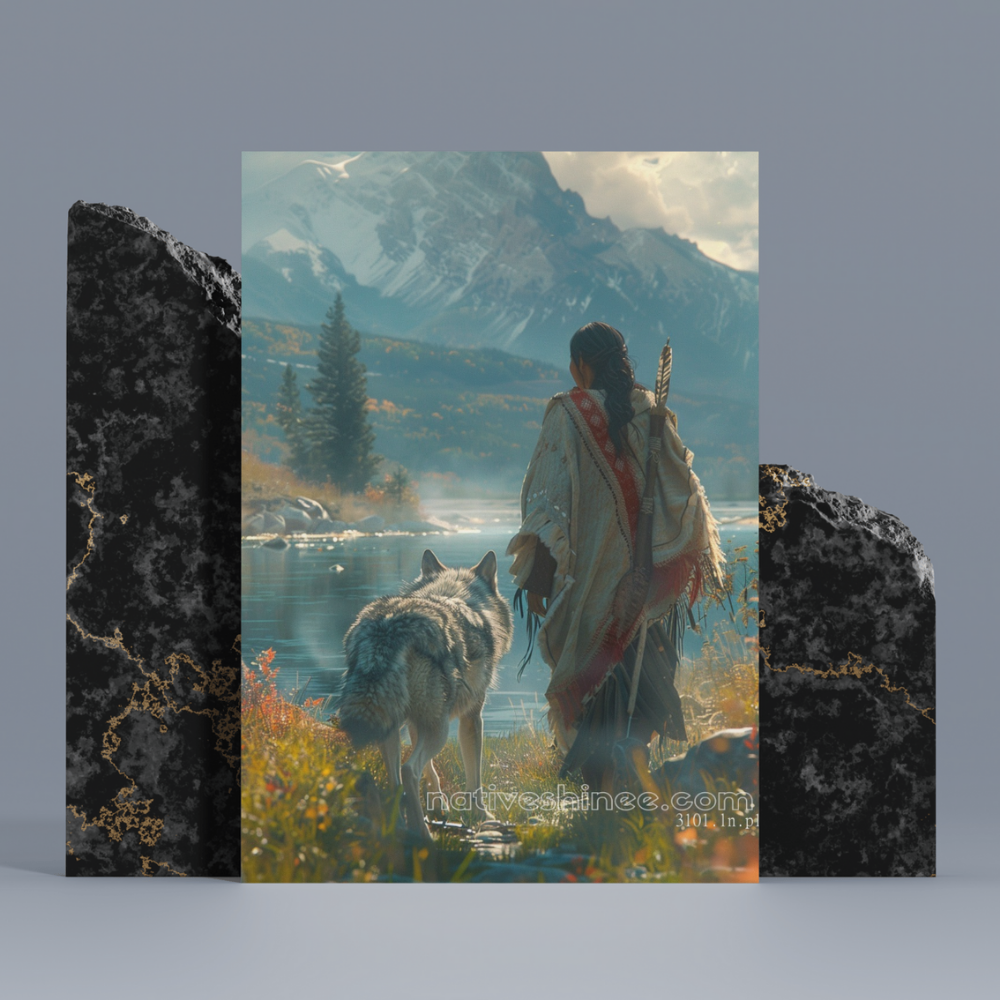 In this breathtaking scene, a Native American woman walks alongside her loyal wolf companion, both journeying toward the majestic mountains that stand as silent guardians of the land. The setting sun casts a warm glow over the serene lake, as the wolf and the warrior share a moment of unity and strength in the wilderness. The peaceful flow of the river reflects the deep connection between the two, as they walk as one with nature. The woman’s ceremonial attire, adorned with intricate beadwork and feathers, symbolizes her cultural heritage and the wisdom passed down from her ancestors. The wolf, often regarded as a symbol of loyalty, courage, and guidance, walks with her as both protector and guide. Together, they are not just part of the natural world—they are intertwined with the very spirit of it. This canvas evokes a sense of reverence for the sacred relationship between humans and animals, and the untamed beauty of the wilderness they call home.