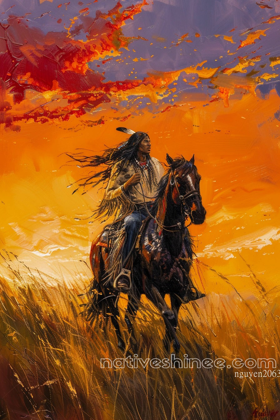 Feel the spirit of freedom and strength with the Warrior at Dusk Native American Canvas. This vivid artwork showcases a Native American warrior riding his horse across the golden plains, with the fiery colors of sunset painting the sky. Adorned in traditional attire, including a feathered headdress, the warrior exudes confidence and pride. The warm hues of the sky blend perfectly with the dynamic movement of the horse, capturing the essence of life in harmony with nature. This stunning canvas is perfect for those who honor Native American heritage and the spirit of the wild.