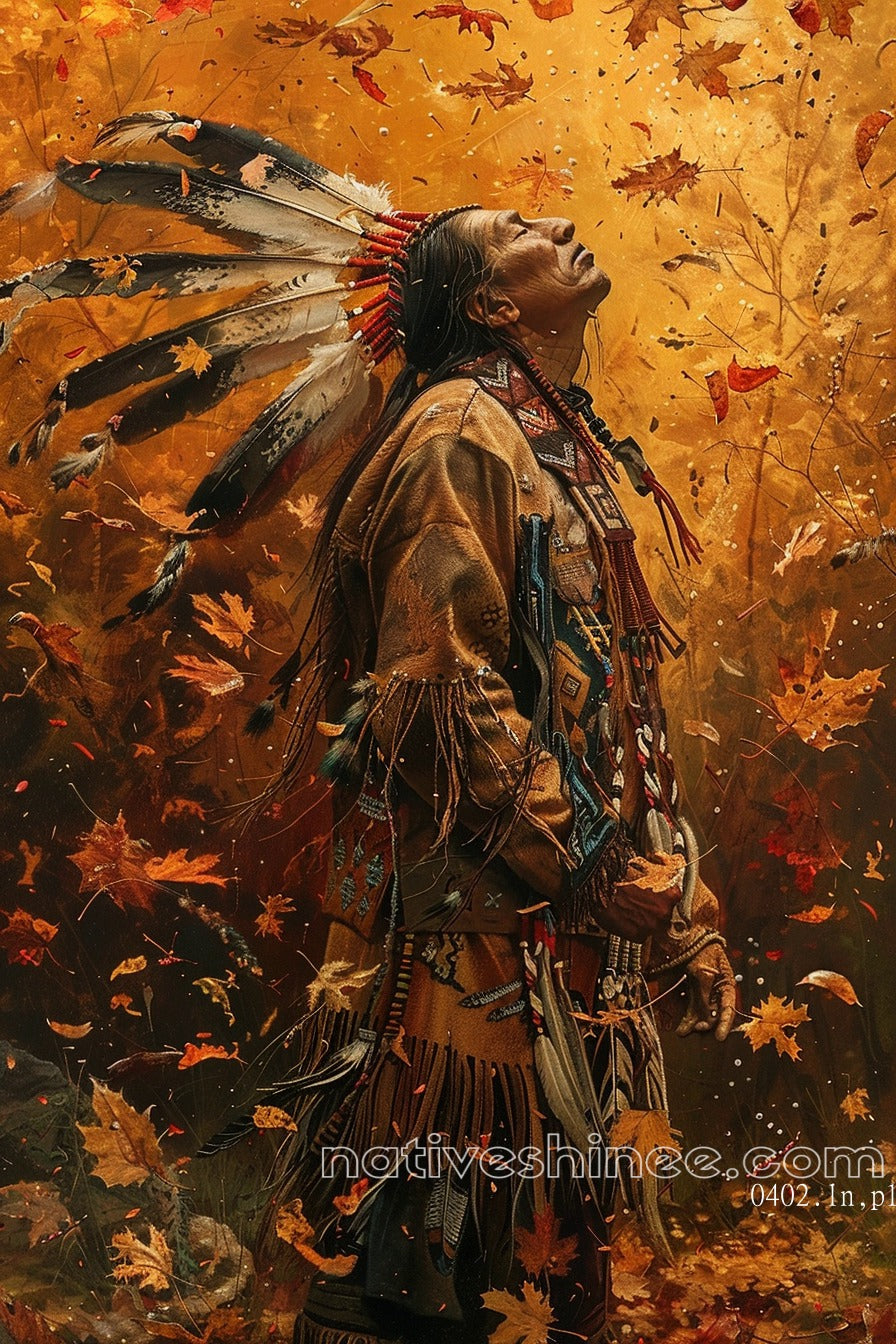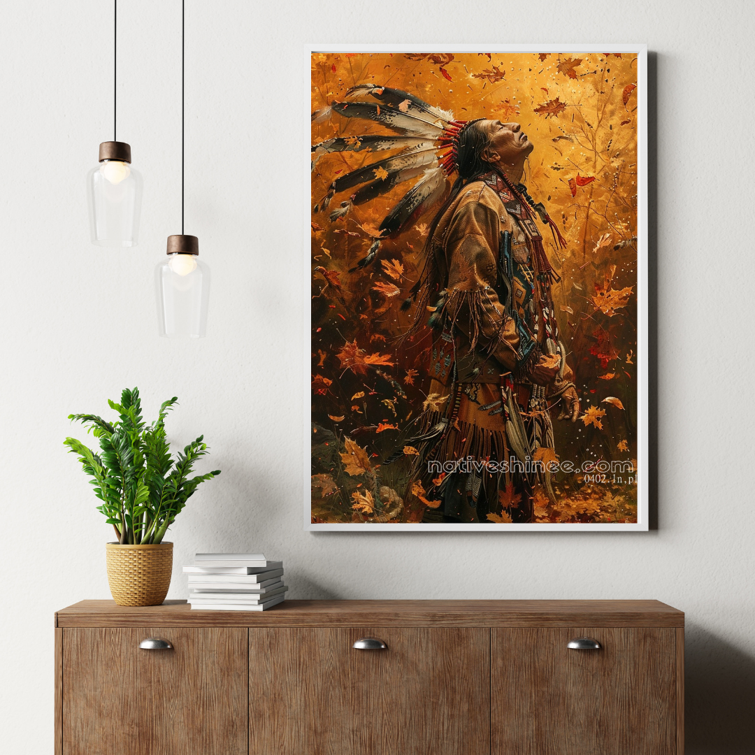 The Warrior in Autumn Leaves Native American Canvas portrays the serene yet powerful figure of a Native American warrior amidst the falling autumn leaves. The vibrant colors of the leaves, combined with the warrior's traditional attire and headdress, create a beautiful connection to nature. This artwork embodies strength, peace, and the deep connection to the earth that Native American culture celebrates. A perfect addition for any home or office, this canvas will evoke reflection and admiration for those who value cultural heritage and the beauty of nature’s changing seasons.