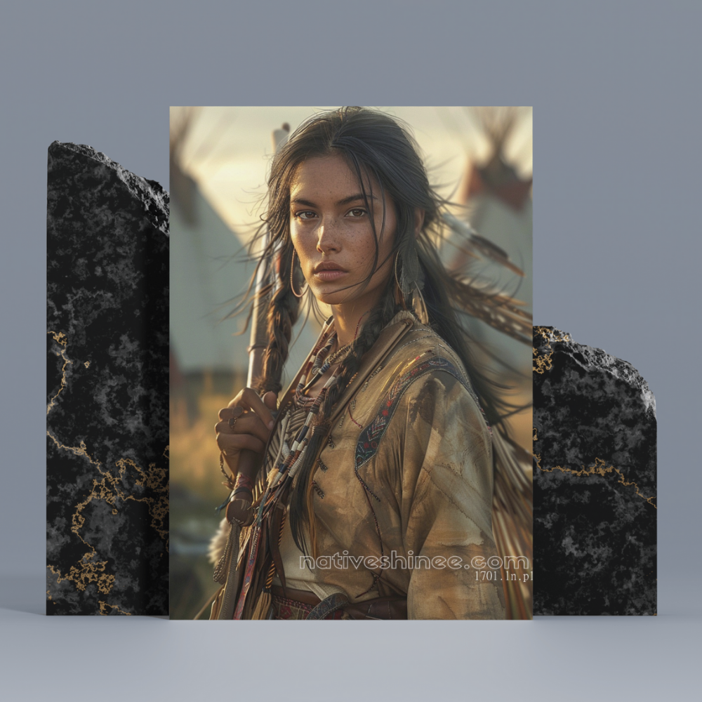 This "Warrior in the Wind" canvas print showcases a Native American woman, standing strong against the winds of time, her braids swaying as she grips a staff adorned with beads and feathers. Dressed in traditional attire, her gaze is fierce and proud, embodying the spirit of resilience and strength. The warm glow of the sun creates a powerful contrast with the details in her clothing, emphasizing her connection to the natural world. The image reflects the beauty and bravery of Native American heritage, making it a captivating piece for those who honor indigenous culture and the warrior spirit.