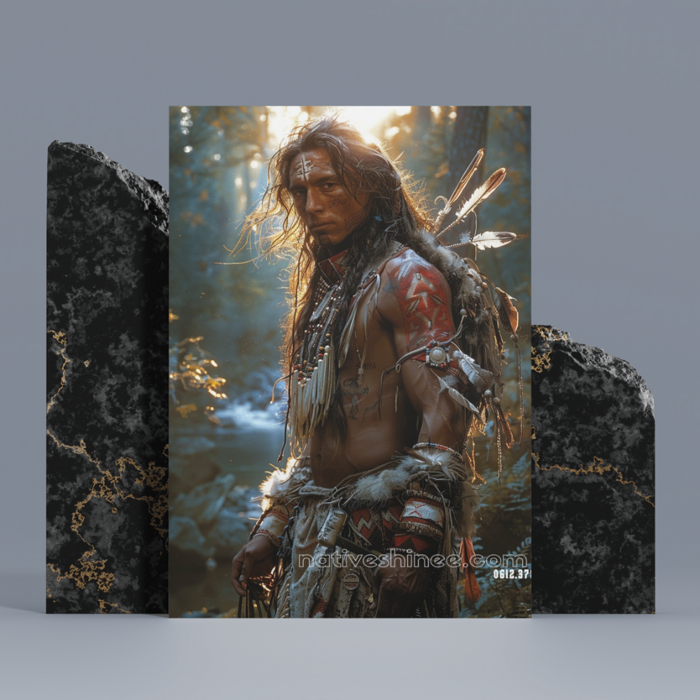Bathed in the golden glow of the rising sun, this striking canvas portrays a proud Native American warrior standing amidst a serene forest. His piercing gaze reflects strength and wisdom, while traditional markings and tattoos adorn his face and body, telling stories of bravery and heritage. Draped in ceremonial attire with feathers, beads, and animal pelts, the warrior embodies the spirit of his ancestors. The interplay of light and shadow through the forest emphasizes his connection to nature, creating a powerful, timeless image of resilience and cultural pride.