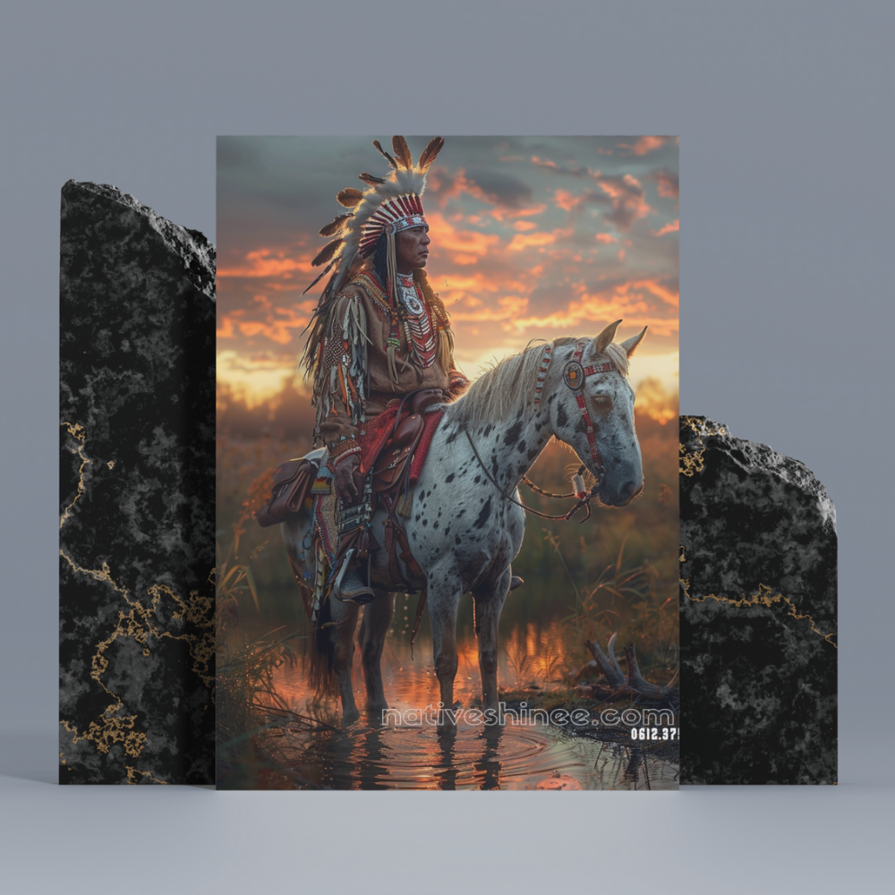 This powerful image portrays a Native American warrior mounted on his horse, standing tall against the backdrop of a vibrant sunset. The rich, glowing hues of the sky illuminate his ceremonial regalia, adorned with intricate beadwork and feathers that symbolize honor and courage. The warrior’s poised stance on the calm waters adds to the moment’s serenity, capturing the timeless connection between the people and the land. His steed, equally adorned with beautiful beadwork, stands beside him, creating a harmonious and noble scene that reflects a deep bond with nature and tradition. This moment, full of pride and strength, represents a heritage of resilience and beauty.