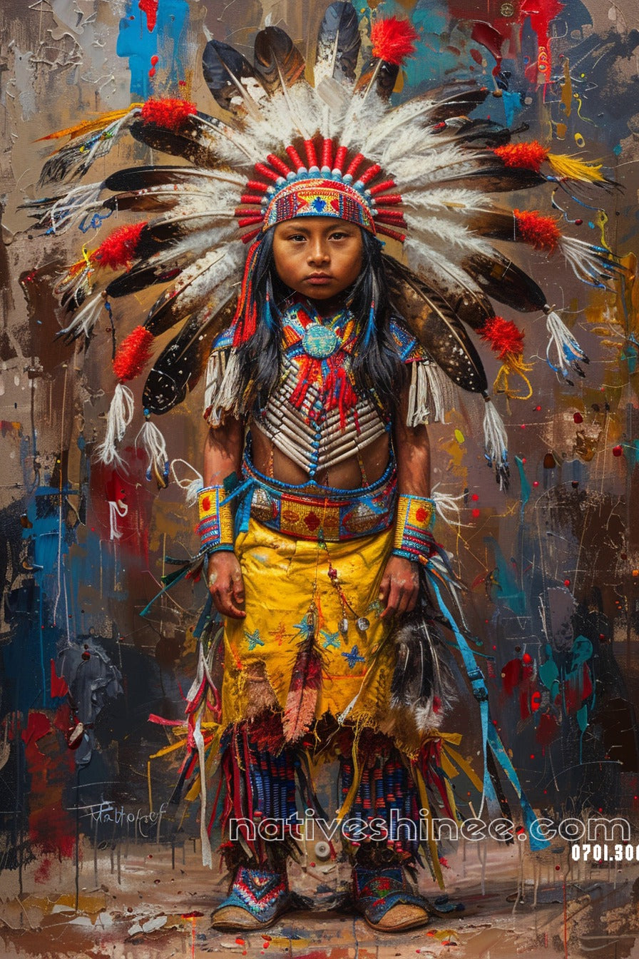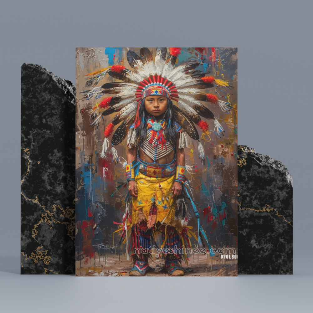 This vibrant canvas captures the essence of Native American heritage, showcasing a young child adorned in traditional attire, embodying both strength and cultural pride. The rich, intricate beadwork and colorful headdress contrast beautifully with the bold and expressive brushstrokes that create an almost contemporary artistic fusion. The child’s serious gaze speaks to the timeless endurance of their people, while the bright feathers and beads emphasize the deep connection to the Earth and their ancestral roots. The background’s abstract colors reflect the raw energy and spirit of Native American life, a celebration of past and present.
