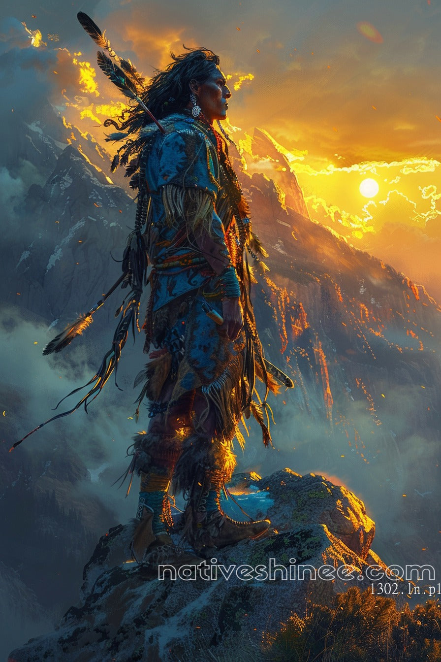 Warrior of the Mountain Native American Canvas showcases a powerful Native American warrior standing tall against a breathtaking mountain landscape. The warrior, dressed in traditional attire adorned with feathers, beads, and furs, gazes into the distance with strength and determination. Surrounded by the glowing warmth of the setting sun and the rugged peaks of the mountains, this artwork symbolizes the enduring spirit and courage of indigenous people. Perfect for those who appreciate Native American heritage, this canvas print brings a sense of majesty and history to any room.