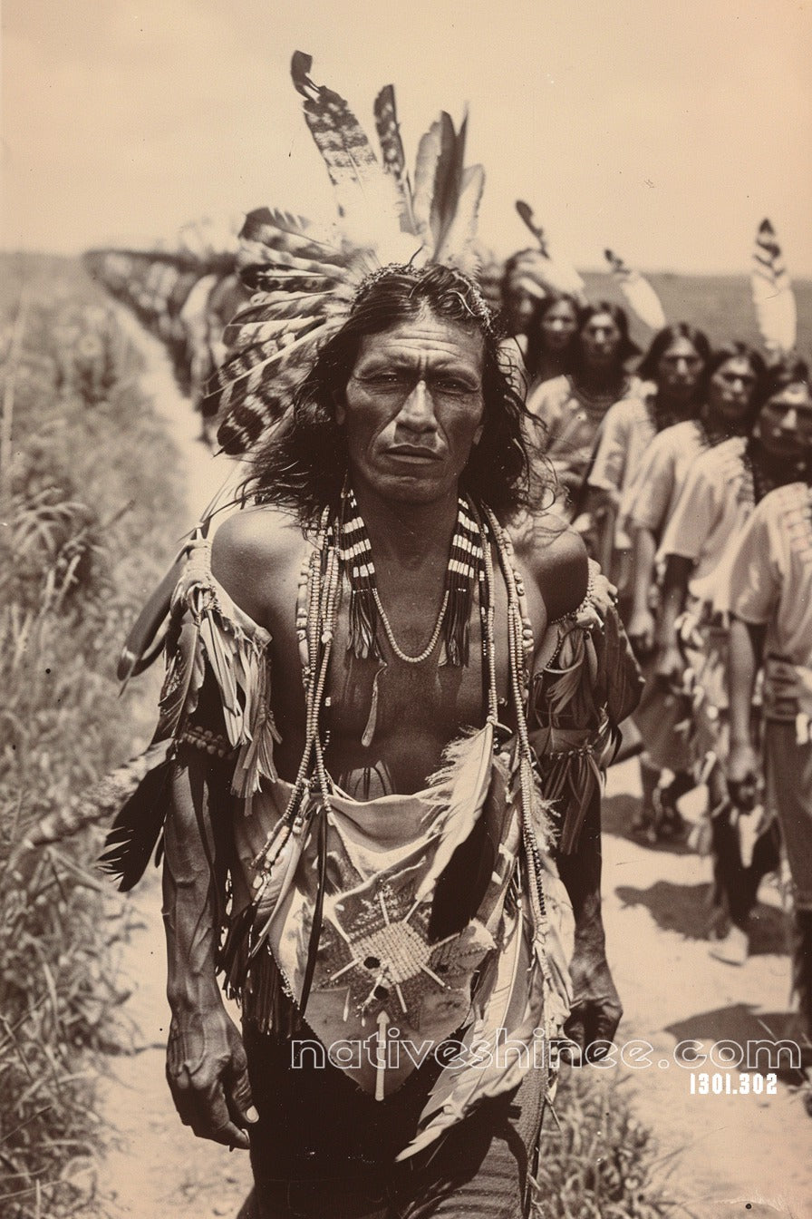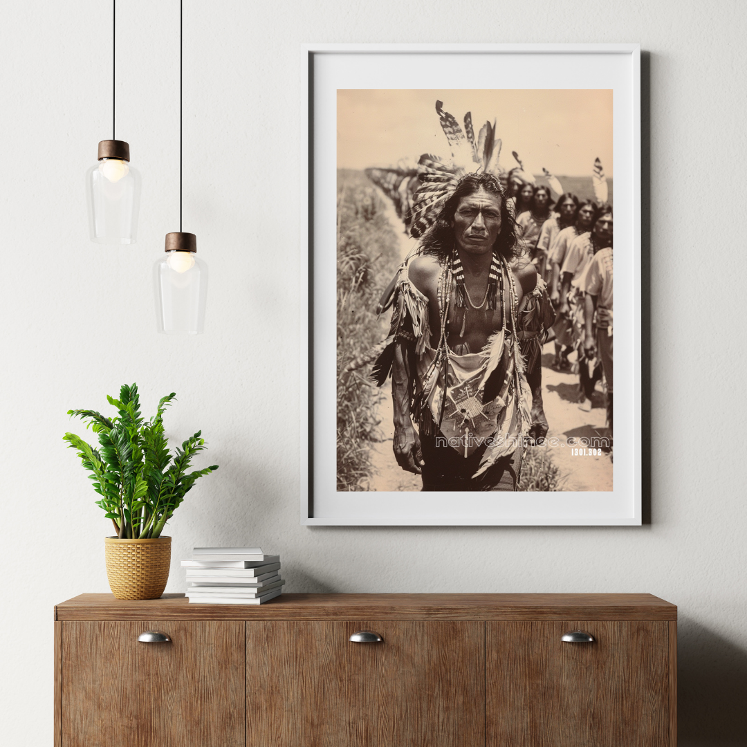 Honor the strength and spirit of Native American warriors with Warrior of the Plains Native American Canvas. This powerful artwork depicts a determined warrior leading a procession, his face radiating leadership and courage. Adorned with traditional beads, feathers, and a beautifully crafted chest piece, his attire reflects the rich cultural heritage of the plains tribes. The image captures a moment of unity and resilience, with his people following in the background, symbolizing the enduring legacy of Native American strength. Perfect for adding depth and meaning to any room, this canvas print serves as a tribute to indigenous warriors and their enduring spirit.